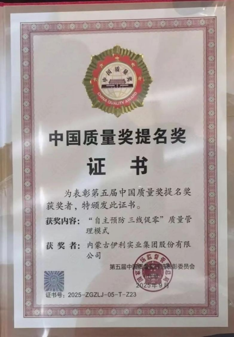 近日,第五届中国质量奖获奖名单正式公布,伊利凭借“‘自主预防 三线促零’质量管理模式”荣获第五届中国质量奖提名奖。能与中核核电、中国船舶集团、哈尔滨飞机工业集团等“国之重器”企业一同荣获该奖项,充分展现了伊利在产业布局、品质管理及技术创新方面的强大实力。